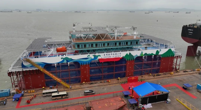中国船舶集团旗下广船国际建造的半潜式深远海智能养殖旅游平台“普盛海洋牧场6号”命名交付。