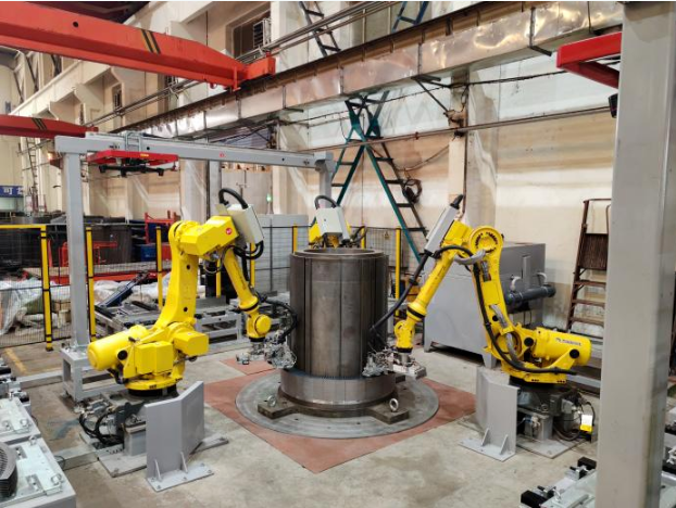 近日,中国船舶集团旗下杰瑞自动化承研的定子铁芯叠装机器人工作站项目通过验收并投入使用,实现了大型高压异步电机关键配套——定子铁芯的自动化生产。