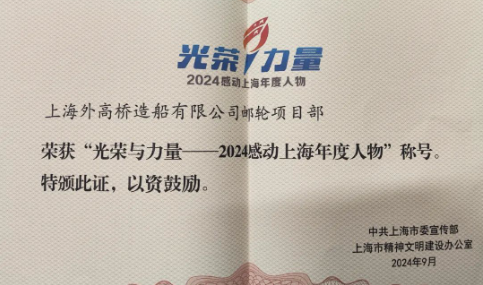 “光荣与力量——2024感动上海年度人物推选活动”获奖名单日前揭晓。中国船舶集团外高桥造船邮轮项目部获评“2024感动上海年度人物”。本次活动以2023年8月至2024年7月中,上海市涌现的事迹突出、精神可嘉、社会认可的模范人物和先进集体为推选对象,通过175万市民网络投票和专家评审推选出先进典型。