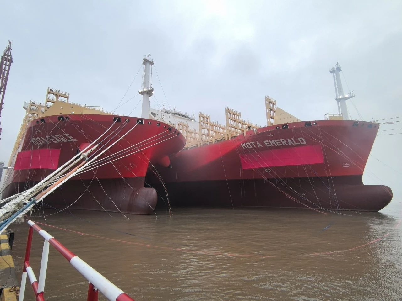10月15日,中国船舶集团旗下江南造船联合中船贸易为太平船务建造的14000TEU液化天然气(LNG)双燃料动力系列集装箱船首制船“KOTA EAGLE(鹰城)”号和2号船“KOTA EMERALD(翠城)”号同日命名,其中“KOTA EAGLE(鹰城)”号于当日签字交付。
