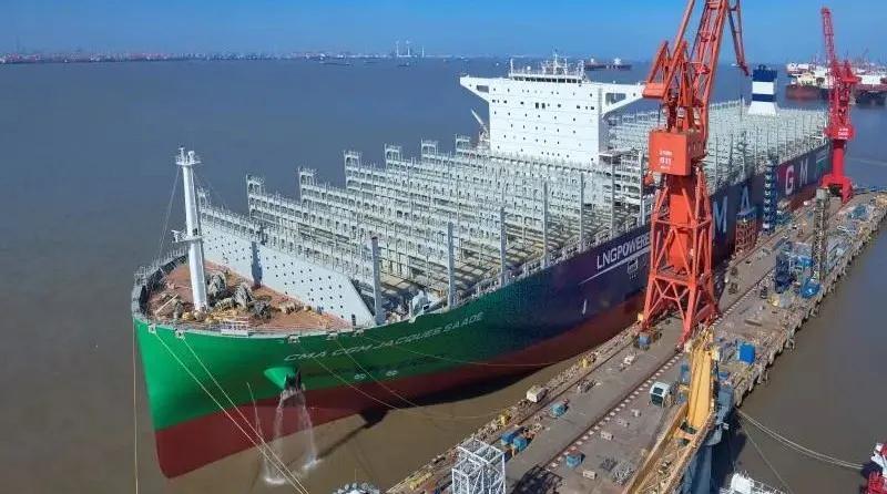 3月16日,中国船舶集团所属沪东中华建造的全球首艘23000箱液化天然气(LNG)动力集装箱船开启了常规试航之旅。该超大型LNG动力集装箱船总长400米,型宽61.3米,服务航速22节,载重量近22万吨,被业界形容为“绿巨人”;采用了一颗独一无二的“绿色心脏”——一个18600立方米的MK Ⅲ薄膜式燃料舱,能满足全球最严格排放要求。