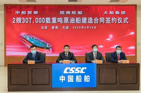 5月18日,中国船舶集团旗下大船集团、中船贸易与招商局集团旗下招商轮船在北京、大连、香港三地以“云签约”方式签署2艘30.7万载重吨原油船建造合同。中国船舶集团副总经理孙伟、招商局集团副总经理王宏、招商轮船董事长谢春林出席签约仪式,中船贸易董事长李洪涛、大船集团总经理杨志忠、招商轮船总经理王永新代表各方在建造合同上签字。