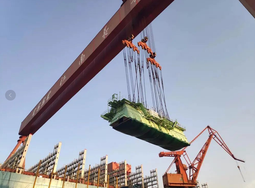 日前,中国船舶集团旗下沪东中华顺利完成23000TEU集装箱船3号船的主机吊装工作,标志着该船向出坞迈出最关键一步。主机吊装整个过程用时不到5天,同时取得仅用2.5天就完成5大件吊装的新突破,为同行业系列船最短纪录。