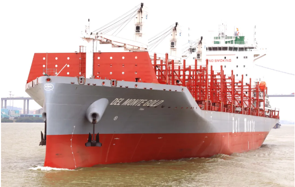 近日,中国船舶集团旗下黄埔文冲为美国Del Monte公司建造的600FEU全冷藏集装箱船首制船“DEL MONTE GOLD”号交付。该型船总长192米,型宽30米,设计吃水9.3米,为国际远洋冷藏集装箱船,全部货柜箱均为冷藏集装箱,是一款冷箱量大、装载灵活、便于维护的绿色环保型船舶。