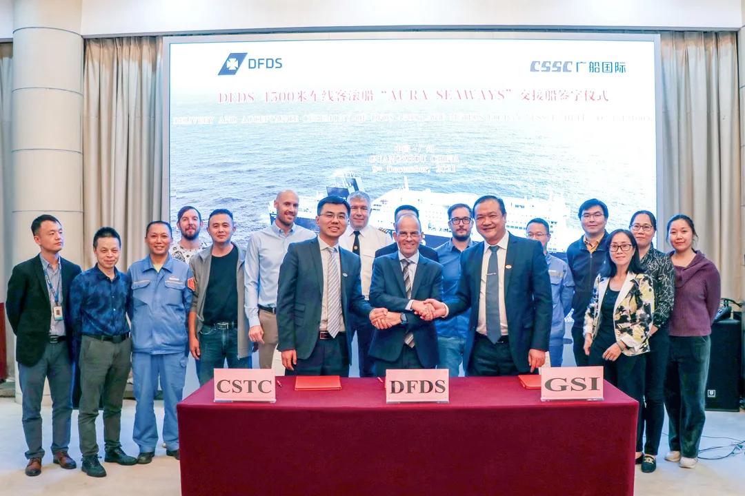 12月9日,由中国船舶集团旗下广船国际联合中船贸易为北欧最大的航运和物流公司,丹麦DetForenede Dampskibs-Selskab(简称:DFDS)航运公司建造的600客/4500米车道豪华客滚船首制船实现“云交付”。