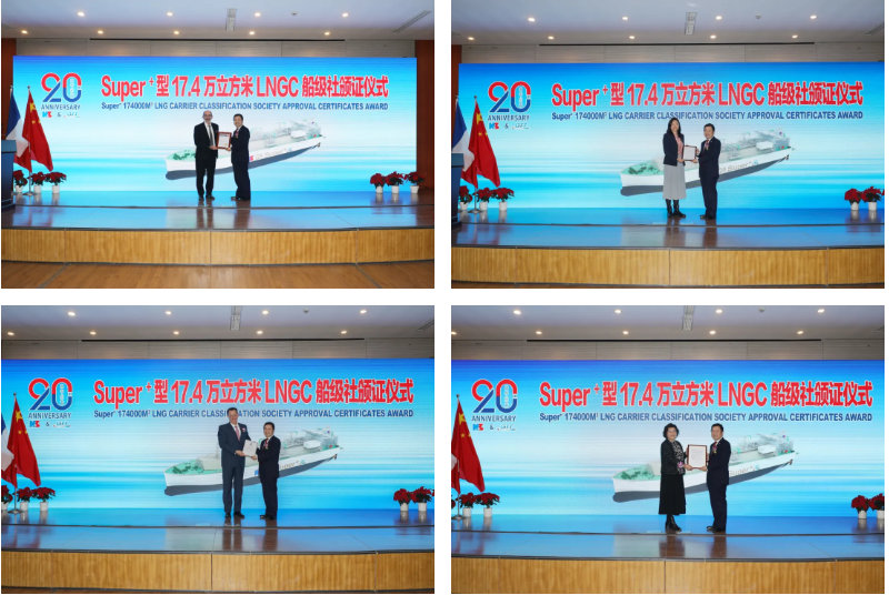 12月16日,由中国船舶集团旗下沪东中华与法国GTT公司联合研发的全球最新一代“长恒系列”17.4万立方米液化天然气(LNG)运输船获得美国船级社(ABS)、法国船级社(BV)、英国劳氏船级社(LR)、DNV等四家国际著名船级社颁发的船型设计通用认可(GDA)、入级预先认可(PCA)等证书。标志着这款集最新设计理念、最优技术装备、最强环保性能、最具前瞻性于一身的“长恒系列”船型达到可以实船建造的状态。这是世界LNG船发展史上的重大事件,更是中国在LNG船研发设计领域从跟跑、并跑到领跑进程中一座重要的里程碑。