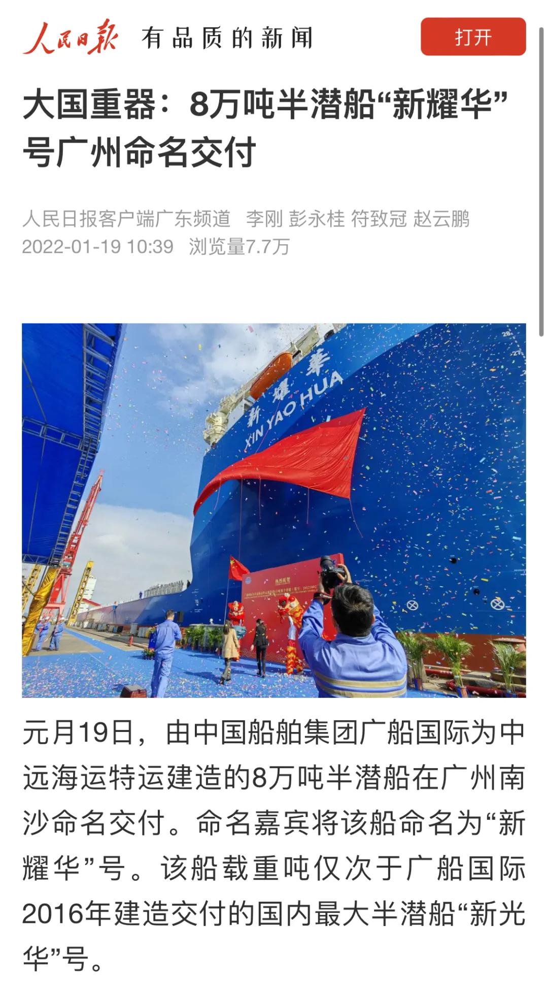 由中国船舶集团建造的这艘8万吨半潜船取名“新耀华”号,既有不忘历史之意,更有勇担责任,建设海洋强国的美好期盼!