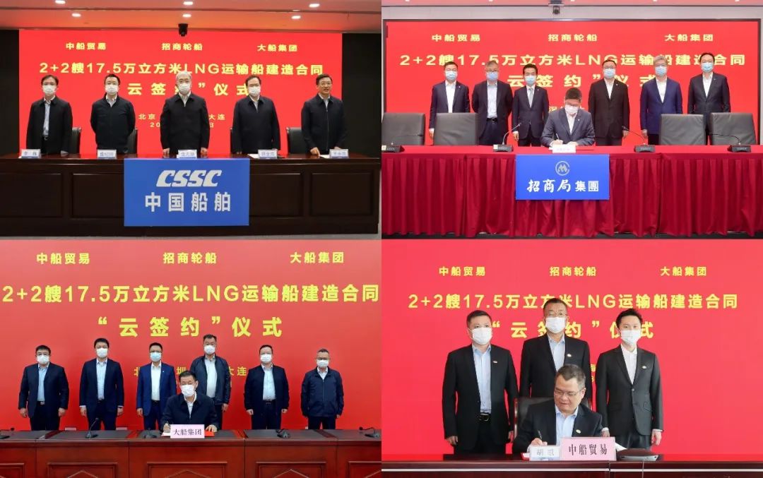 3月31日,中国船舶集团有限公司旗下大船集团联合中船贸易与招商局集团有限公司旗下招商轮船在上海、深圳、大连及北京四地以“云签约”方式签署2+2艘17.5万立方米大型液化天然气(LNG)运输船建造合同。中国船舶集团党组书记、董事长雷凡培,党组副书记、总经理杨金成,党组成员、副总经理盛纪纲,招商局集团董事长缪建民、总经理胡建华、董事王宏出席签约仪式。雷凡培、缪建民在仪式上致辞。