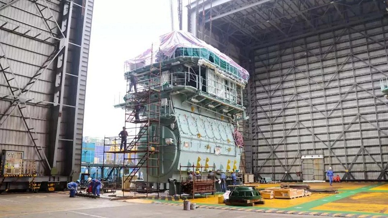 1号船坞里,4层楼高的主机吊装完成