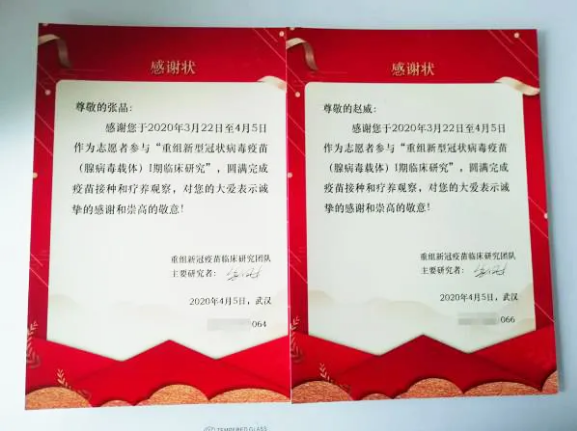 △ 新冠疫苗临床研究团队给张晶夫妇颁发的“感谢状”