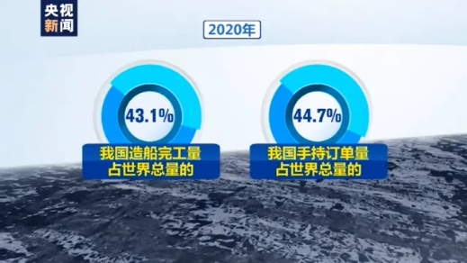 据统计,2020年,我国造船完工量和手持订单量,分别占世界总量的43.1%和44.7%,继续在国际市场份额中继续领先。