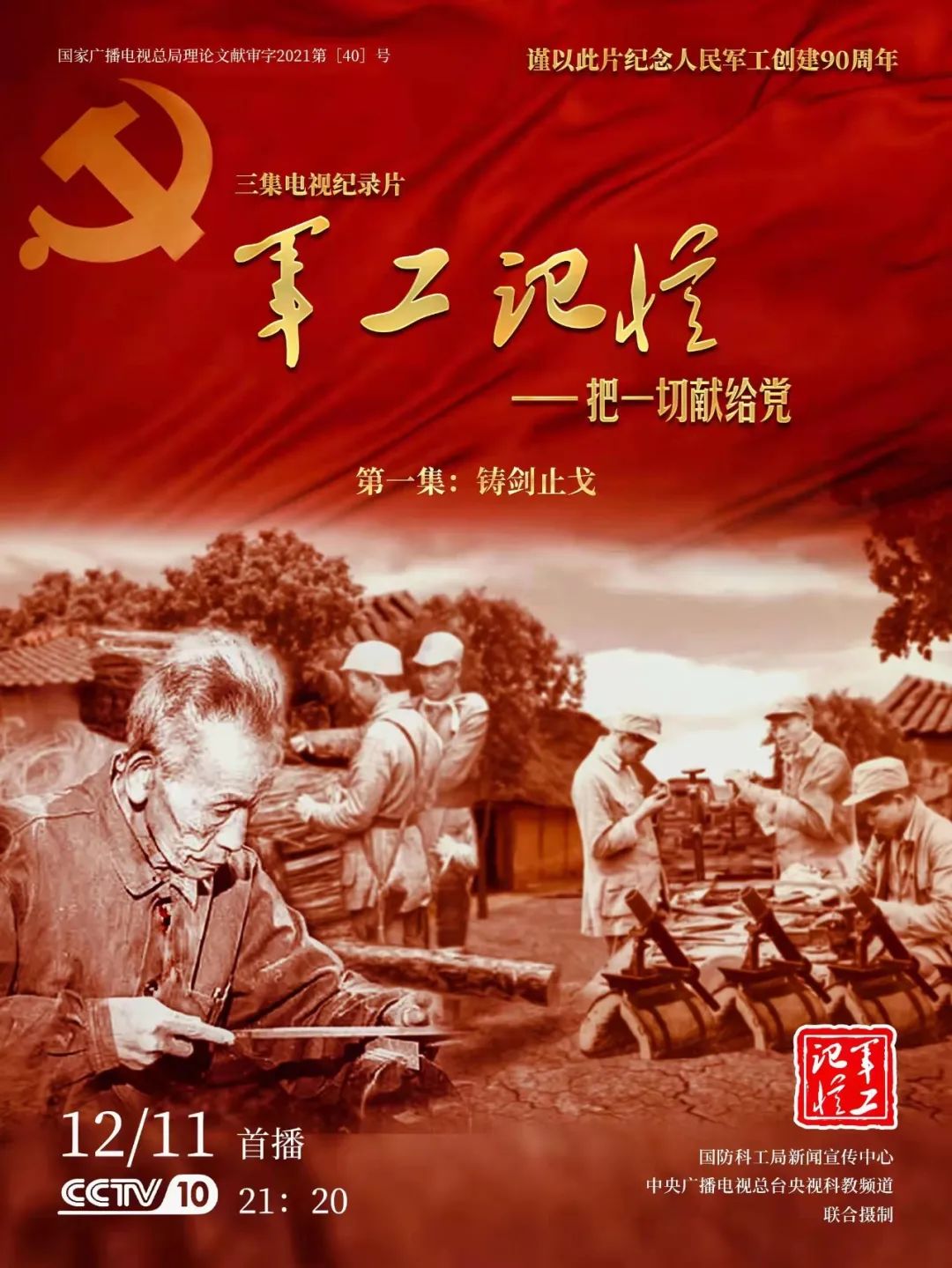 为庆祝中国共产党成立100周年,纪念党领导下的人民军工创建90周年,由国防科工局指导,国防科工局新闻宣传中心联合中央广播电视总台社教节目中心摄制,各军工集团大力支持的3集重大理论文献电视纪录片《军工记忆——把一切献给党》,将于12月11日21:20在央视科教频道(CCTV-10)《探索发现》栏目首播,连续播出3天。该纪录片旨在向建党百年献礼,向人民军工90周年致敬,向全社会弘扬军工精神传递军工文化,激励国防科技工业战线广大干部职工不忘初心、接续奋斗,为实现强军强国梦想贡献力量。