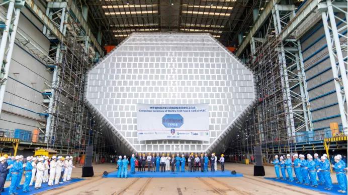 VLEC建造团队在船东、配套厂商和船级社等各方密切配合下,共同克服新冠肺炎疫情等不利因素,攻克B型液货舱核心关键技术难点,注重项目管理导向、革新工艺工法、镍钢焊接程序、薄板变形控制和优化建造流程。从2019年12月底合同签约到今天首制船的完工交付,总建造周期24个月,码头舾装周期4个月,均开创了江南造船大型液化气船首制船最短周期纪录,实现了复杂船型节拍化建造。