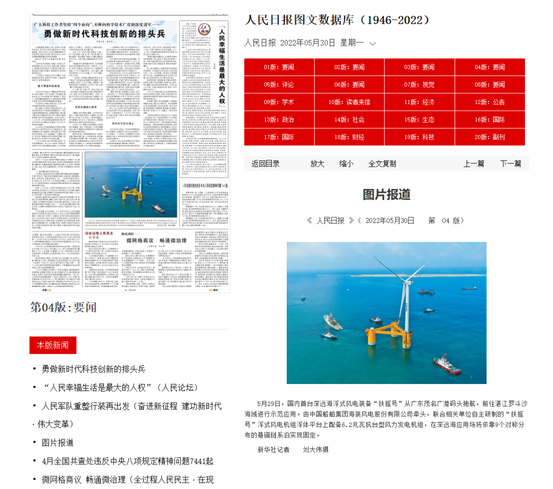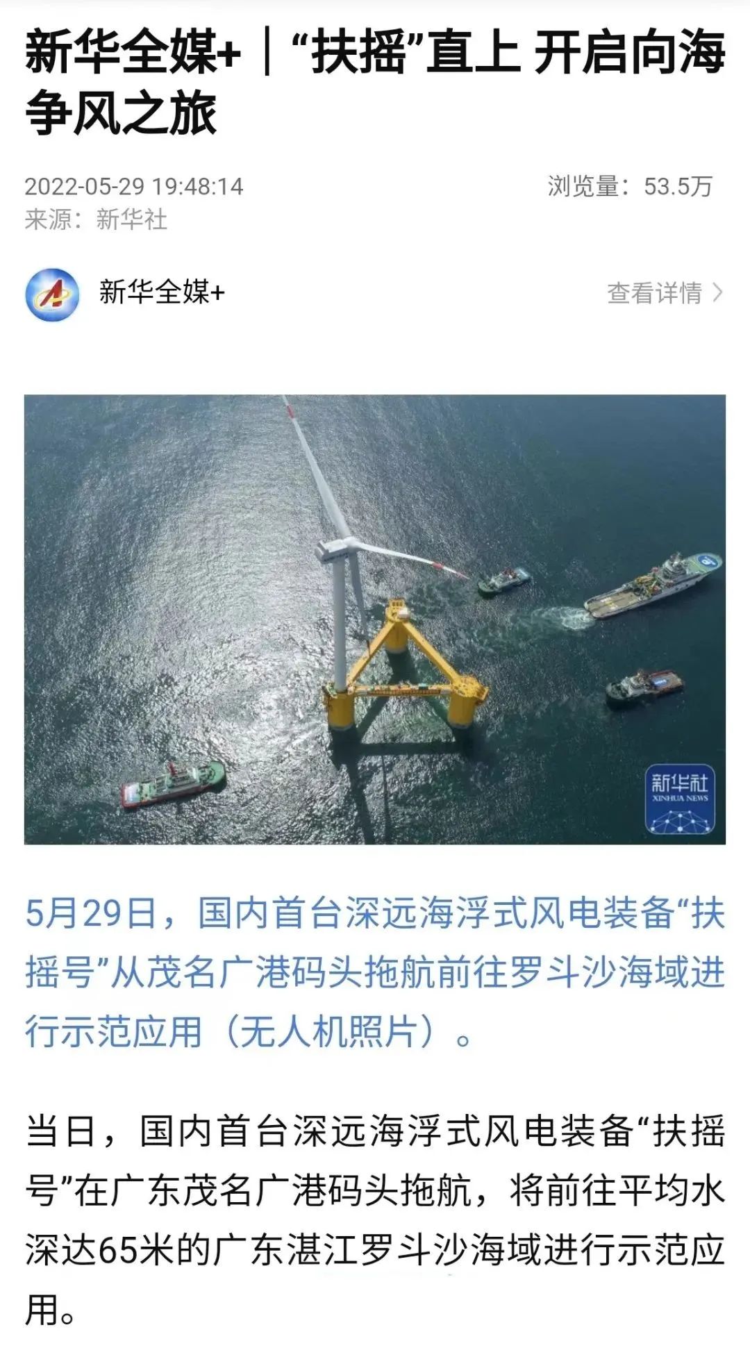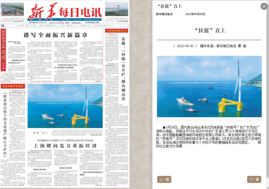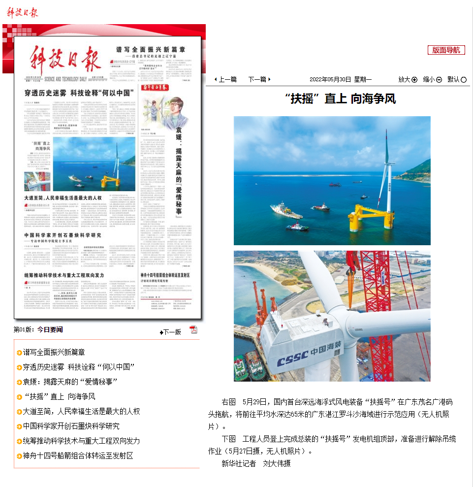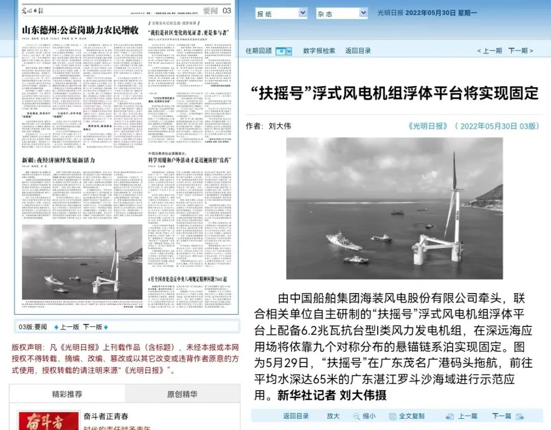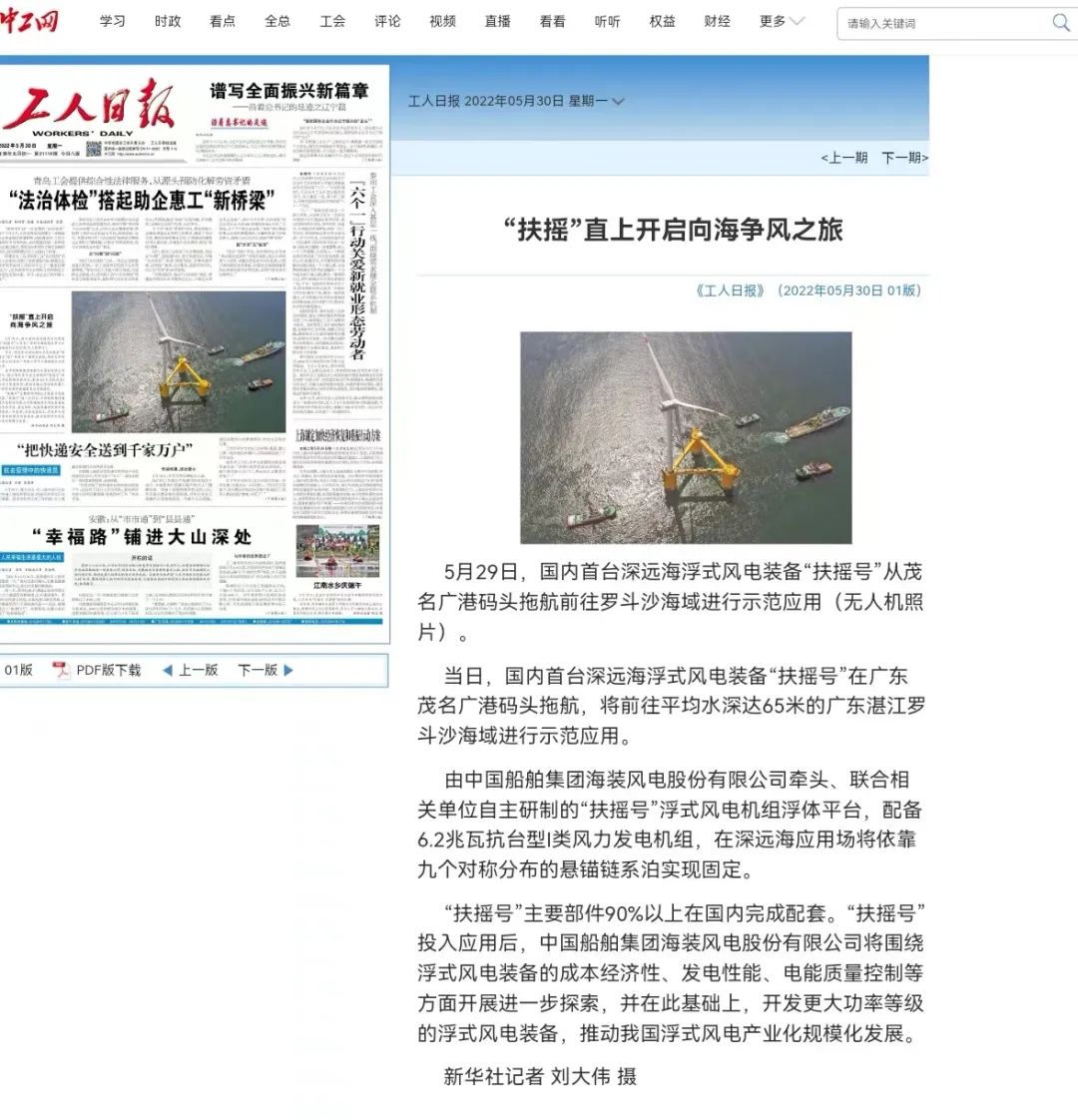 5月29日,中国船舶集团旗下中国海装牵头研制的国内首台深远海浮式风电装备——“扶摇号”从广东茂名码头起航,前往平均水深65米的广东湛江附近海域投入示范应用。