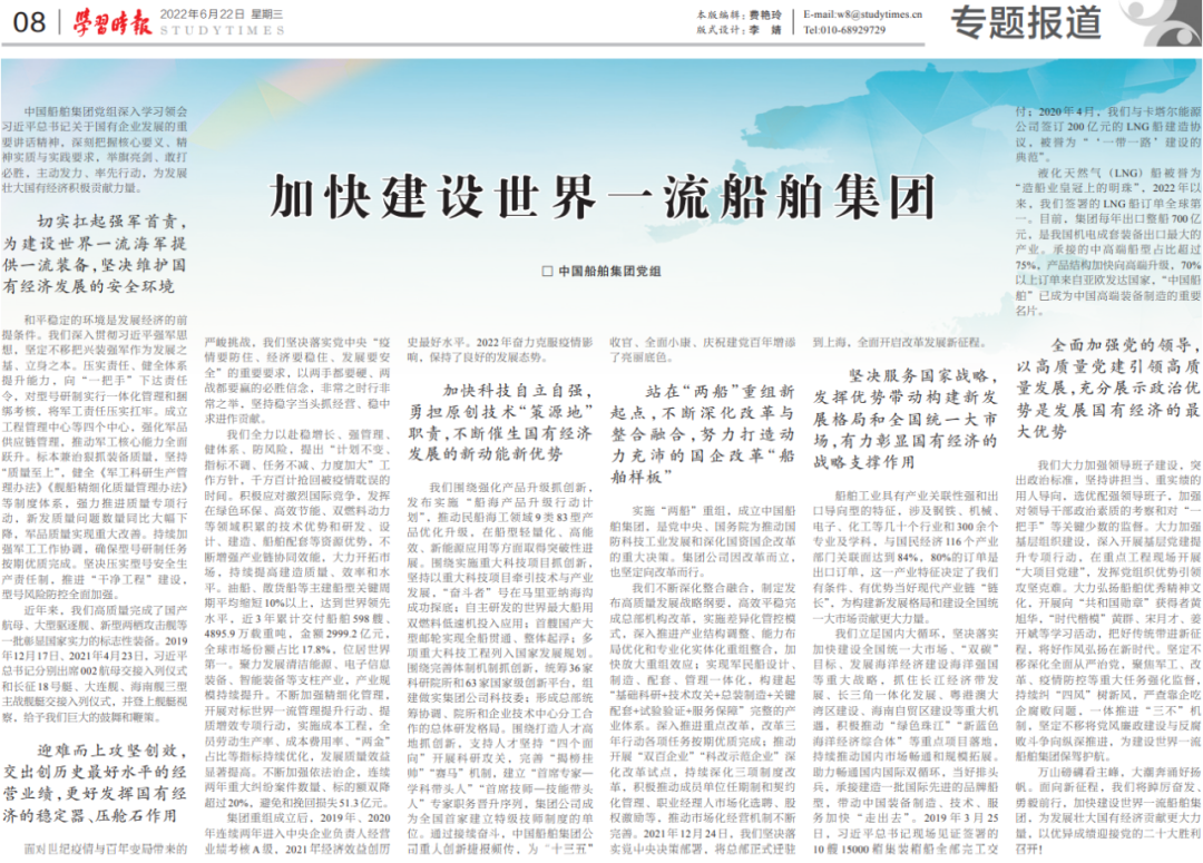 6月22日,《学习时报》发表中国船舶集团党组署名文章《加快建设世界一流船舶集团》,万山磅礴看主峰,大潮奔涌好扬帆,面向新征程,中国船舶集团将踔厉奋发、勇毅前行,为发展壮大国有经济贡献更大力量,以优异成绩迎接党的二十大胜利召开。