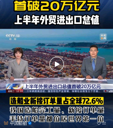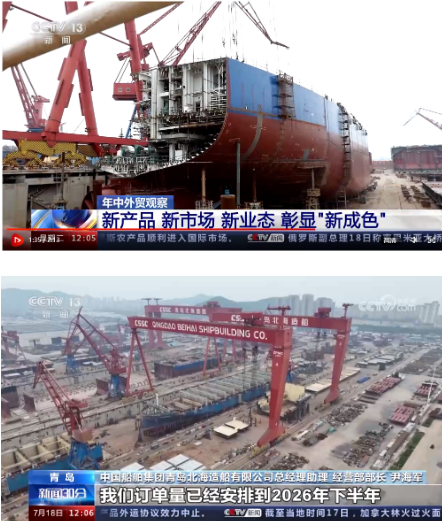 7月18日,央视《新闻30分》年中外贸观察镜头再次对准火热的造船市场,在出口面临较大外需压力的背景下,上半年,中国外贸顶住了压力、稳住了规模、提升了质量,既呈现出“韧性”底色,又展现了多种“新”的成色。