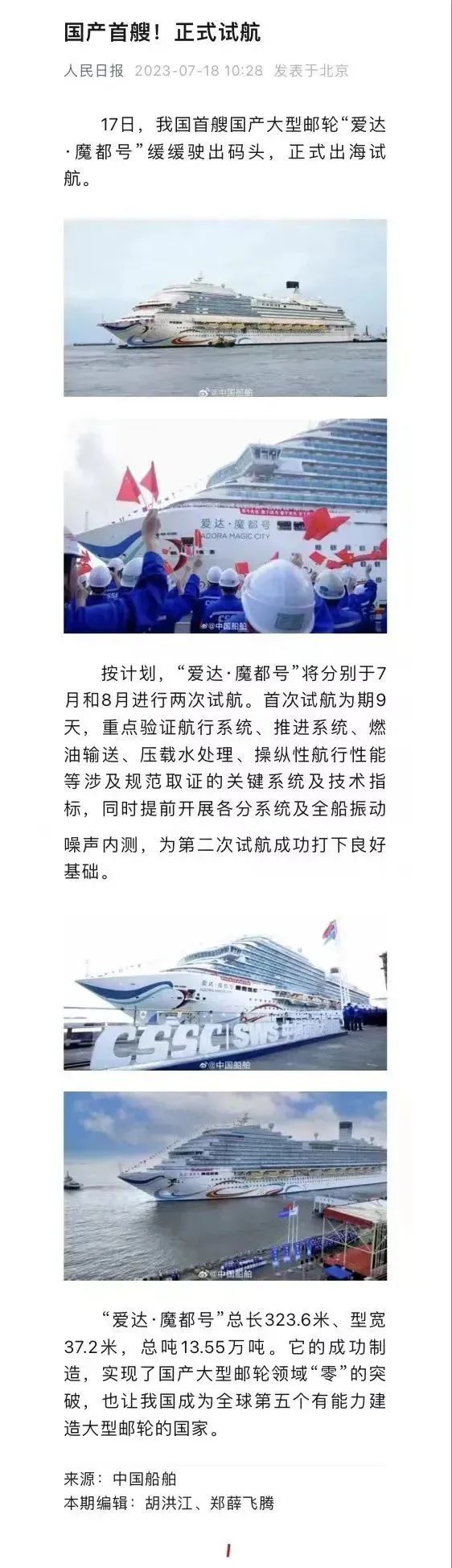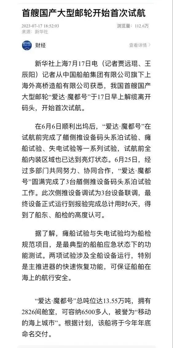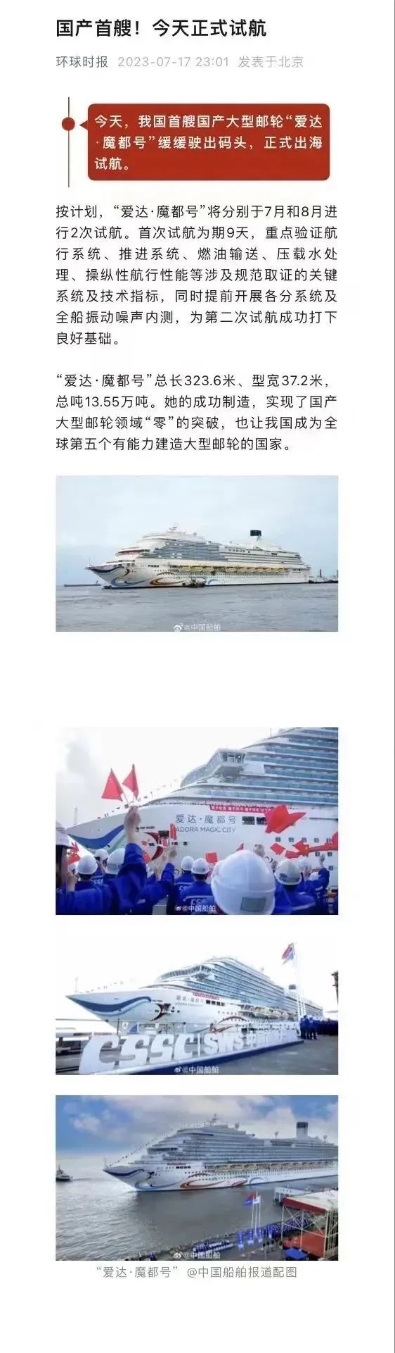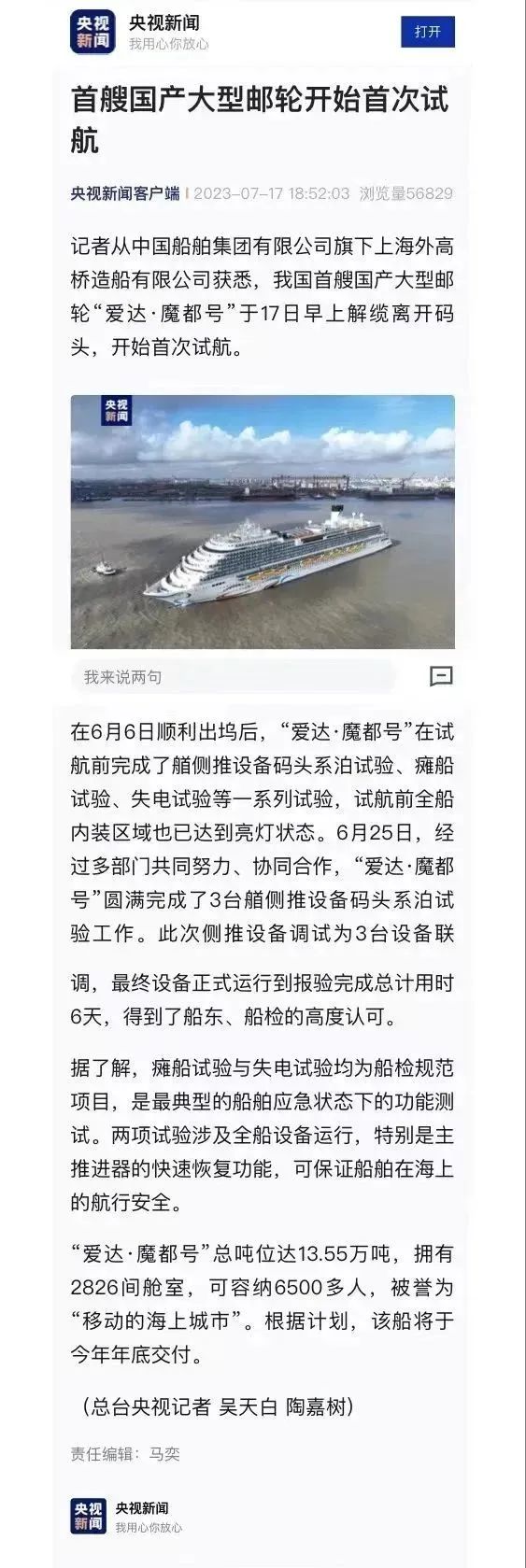 媒体聚焦| 国产首制大型邮轮试航刷屏!
