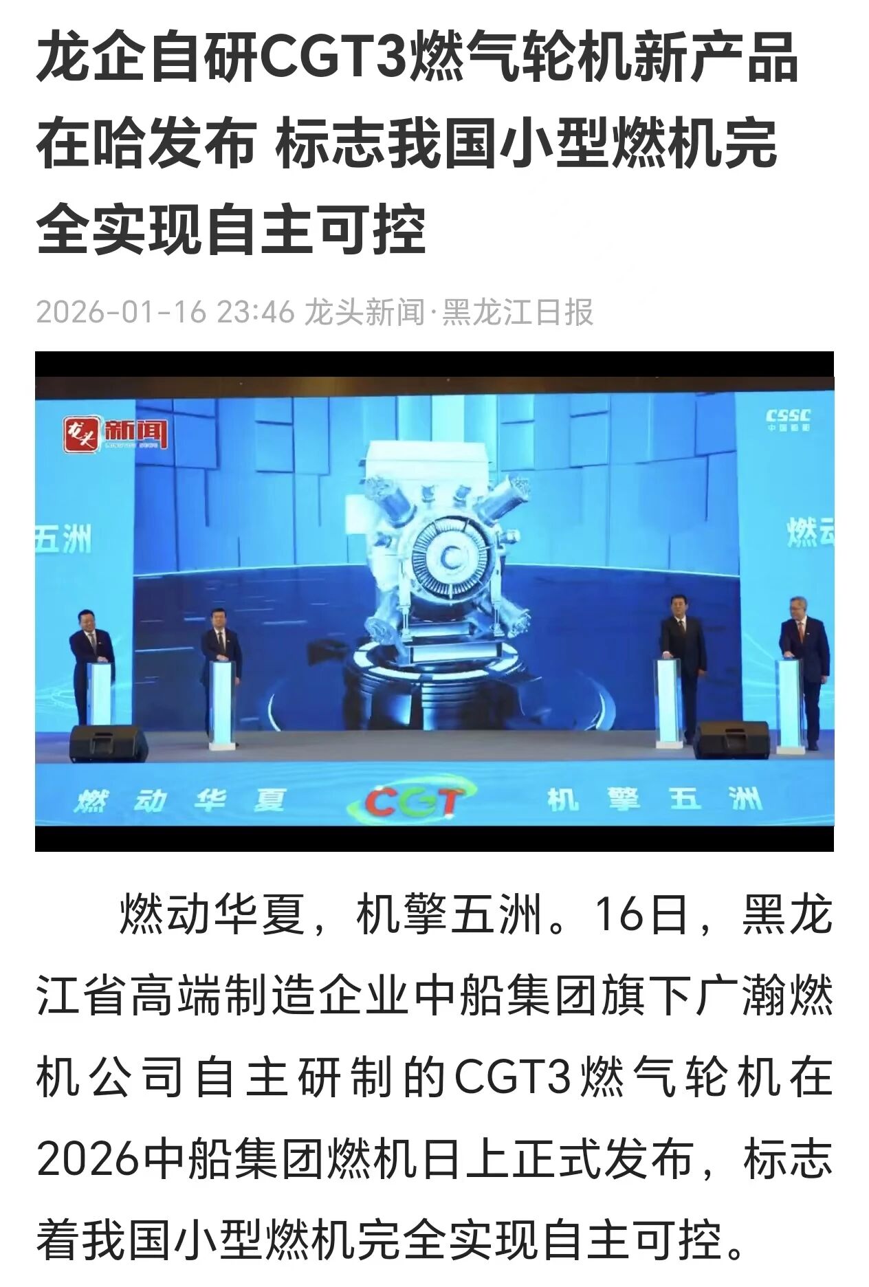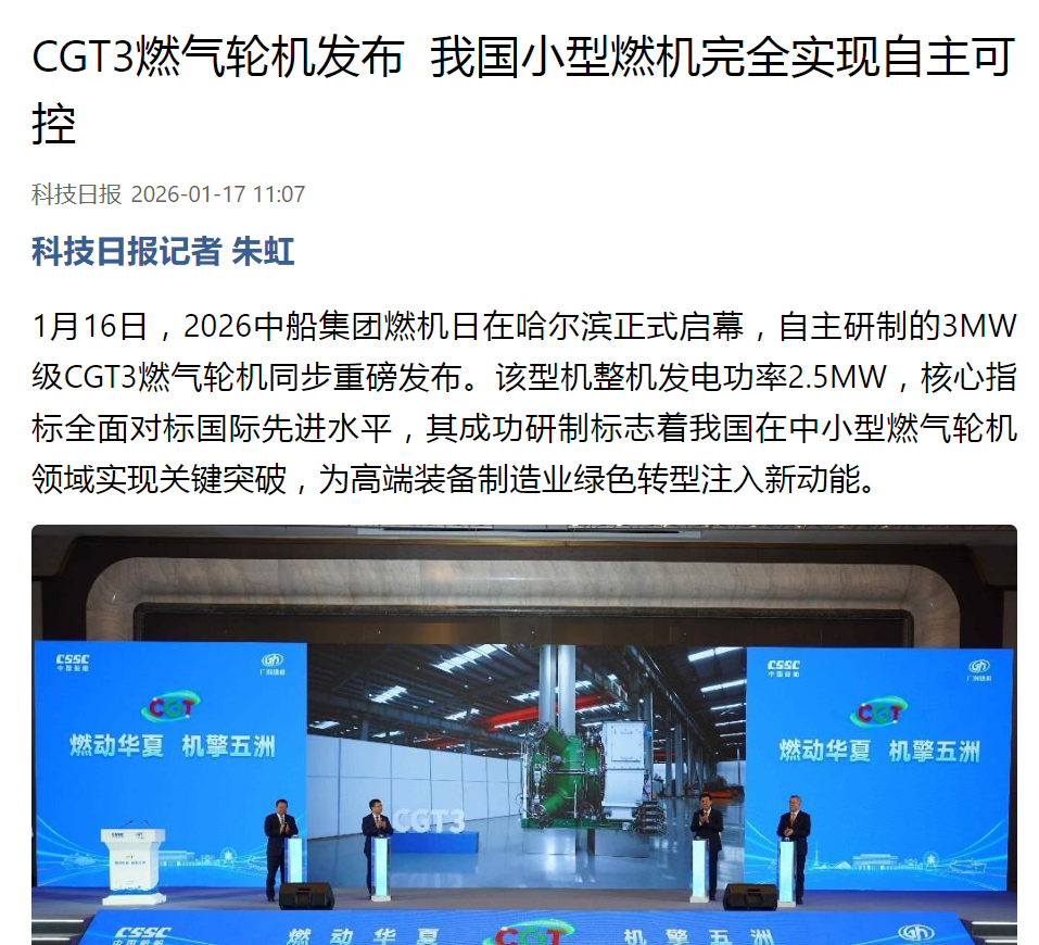 燃动华夏 机擎五洲。1月16日-17日,2026中船集团燃机日活动在黑龙江哈尔滨举行,由中船集团七〇三所自主研制的CGT3燃气轮机在活动期间重磅发布。CGT3燃气轮机核心指标全面对标国际先进水平,其成功研制标志着我国在中小型燃气轮机领域实现关键突破,活动引发新华社、央视、科技日报、黑龙江日报等多家中央及地方媒体关注报道。