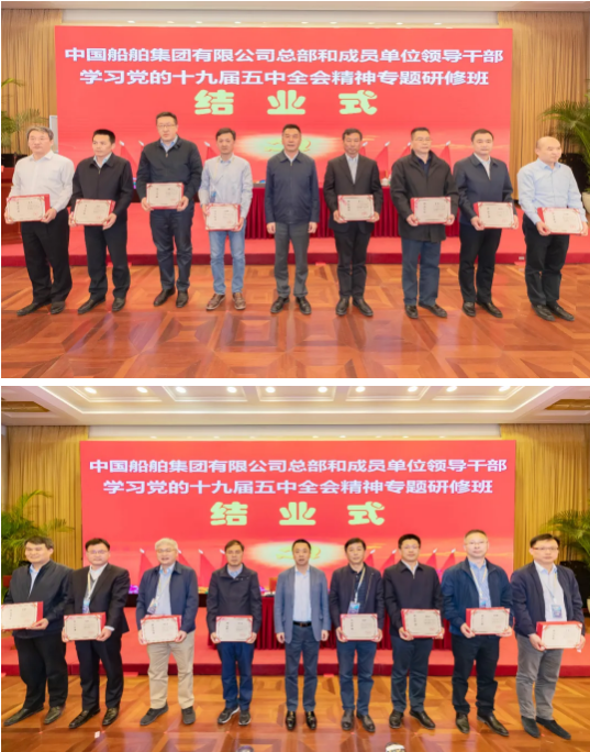 4月23日,中国船舶集团有限公司总部和成员单位领导干部学习党的十九届五中全会精神和党史学习教育专题研修班圆满结业。培训期间,中国船舶集团党组书记、董事长雷凡培以《深入贯彻落实习近平总书记重要指示批示精神 努力加快建设世界一流船舶集团》为题给全体学员们讲授了第一课,中国船舶集团党组副书记、总经理杨金成,党组成员、副总经理孙伟、盛纪纲以及相关部门负责人先后出席各期结业式并听取了学员们的学习汇报。