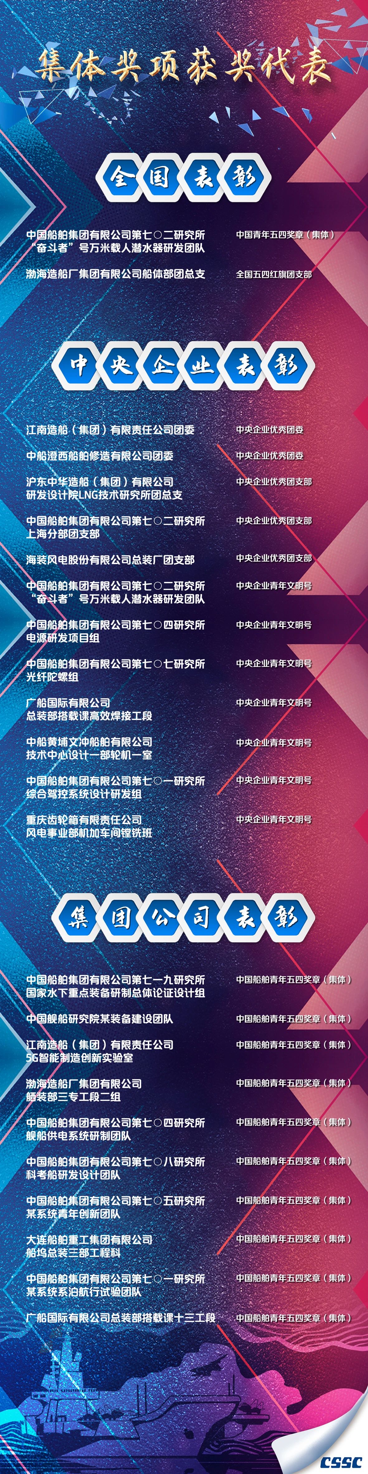 有的在生产一线不畏艰难、埋头苦干,有的在服务集团发展的最基层不计得失、任劳任怨。他们把个人理想融入世界一流船舶集团的伟大事业中,书写着新时代的青春答卷,彰显着新时代青年的责任与担当,为船舶青年作出了榜样,树立了标杆。