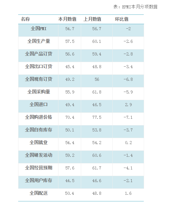 具体观察各项指标,PMI指标为54.7%,比上月回落2个百分点。生产量指标为57.5%,比上月回落2.6个百分点。产品订货指标为56.6%,比上月回落2.8个百分点。进口指标为49.4%,比上月回升2.9个百分点。自有库存指标为50.1%,比上月回落3.7个百分点。就业指标为54.4%,比上月回升0.2个百分点。