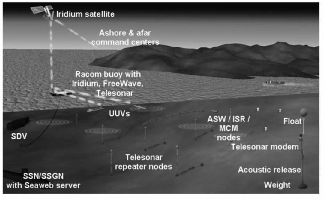20世纪80年代后期,美国开始研制和部署采用光纤传输和局域网技术的分布式固定监视系统,主要包括固定式分布系统(FDS)和先进可部署系统(ADS),同时,为弥补固定式阵列的不足,美海军先后发展了舰载拖曳阵监视系统(SURTASS)和多功能拖曳阵列(MFTA),装备在水面舰船上,弥补固定式探测阵列无法移动的缺陷。上述固定式和拖曳式装备共同构成了综合水下监视系统(IUSS)。20世纪90年代开始,由于无线传感器网络的发展,美海军又将水下信息感知的重点聚焦到网络化反潜预警方面,“广域海网”(Seaweb)、“近海水下持续监视网络”(PLUSNet)、可部署自动分布式系统(DADS)就是其中的代表。“广域海网”是美海军基于“网络中心战”思想建设的“部队网”的水下部分。目的是通过可靠的传输链路,将传感器网络、信息网络与作战网络进行合成,使每一个传感器、每一艘舰艇、每一架飞机都能成为体系中的一个节点;通过可靠的通信链路,各个固定或移动节点均可自由地接入网络,快速准确地发送、接收信息,实现各平台、节点之间的通信,并能在出现故障的情况下自我修复,从而构成跨系统、跨任务、跨平台、跨国的综合性分布自主式水下作战信息网络体系,实现对水下作战信息的广泛获取、自由联通、高度集成融合、交互共享和应用,为浅海复杂环境下对安静型潜艇实施作战提供有力的信息支持,以夺取近海水下作战空间优势。