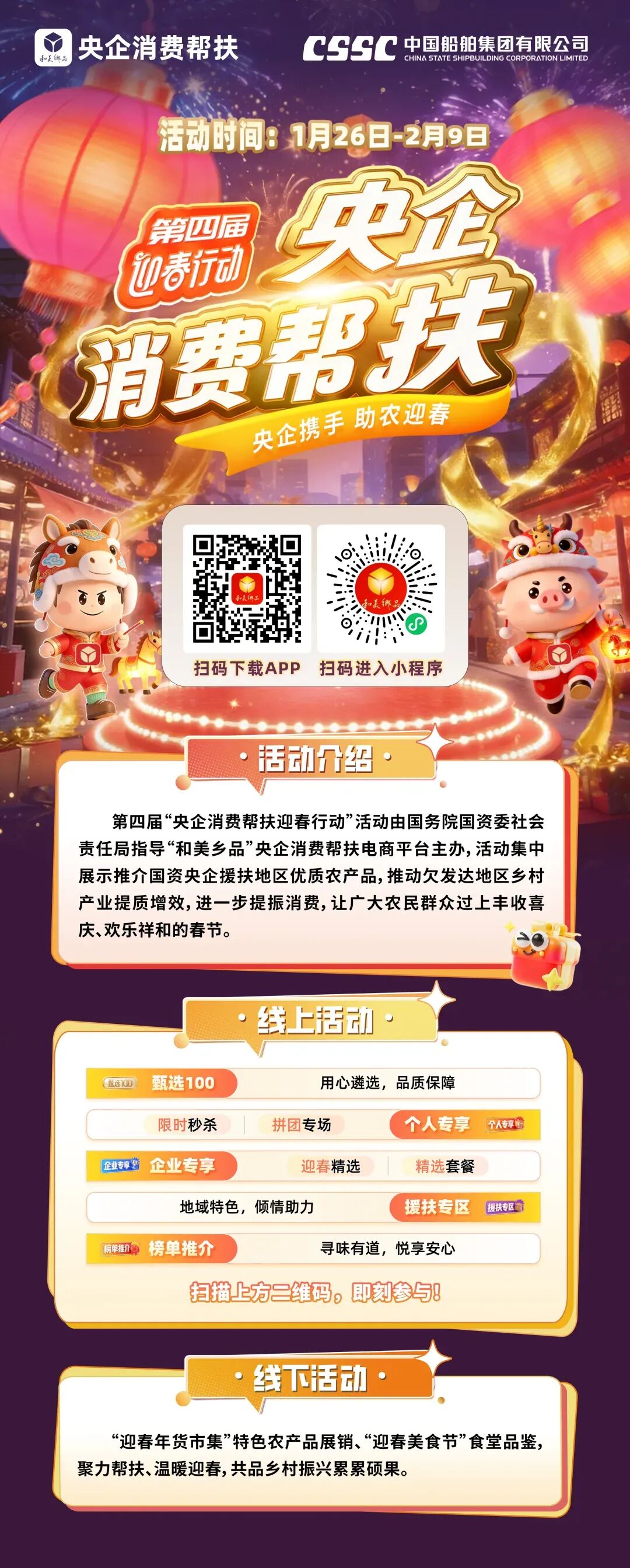 为深入贯彻党中央、国务院关于消费帮扶的决策部署,落实国资委相关工作要求,中船集团积极组织参与2026“央企消费帮扶迎春活动”,以消费帮扶持续巩固拓展脱贫攻坚成果、助力乡村振兴,鼓励各单位及员工踊跃参与,推动帮扶地区群众稳定增收,让广大农民群众共享发展成果、欢度新春。